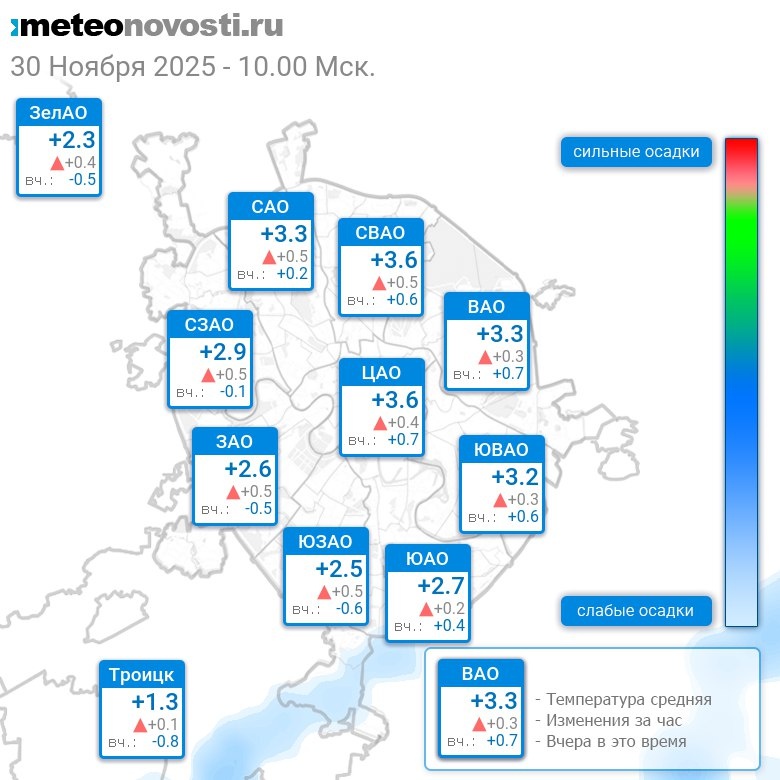 В 10:00 в Москве было от +1.3°C до +3.9°C, средняя температура +3°C #погода #Москва #осень #температура #30ноября #воскресенье