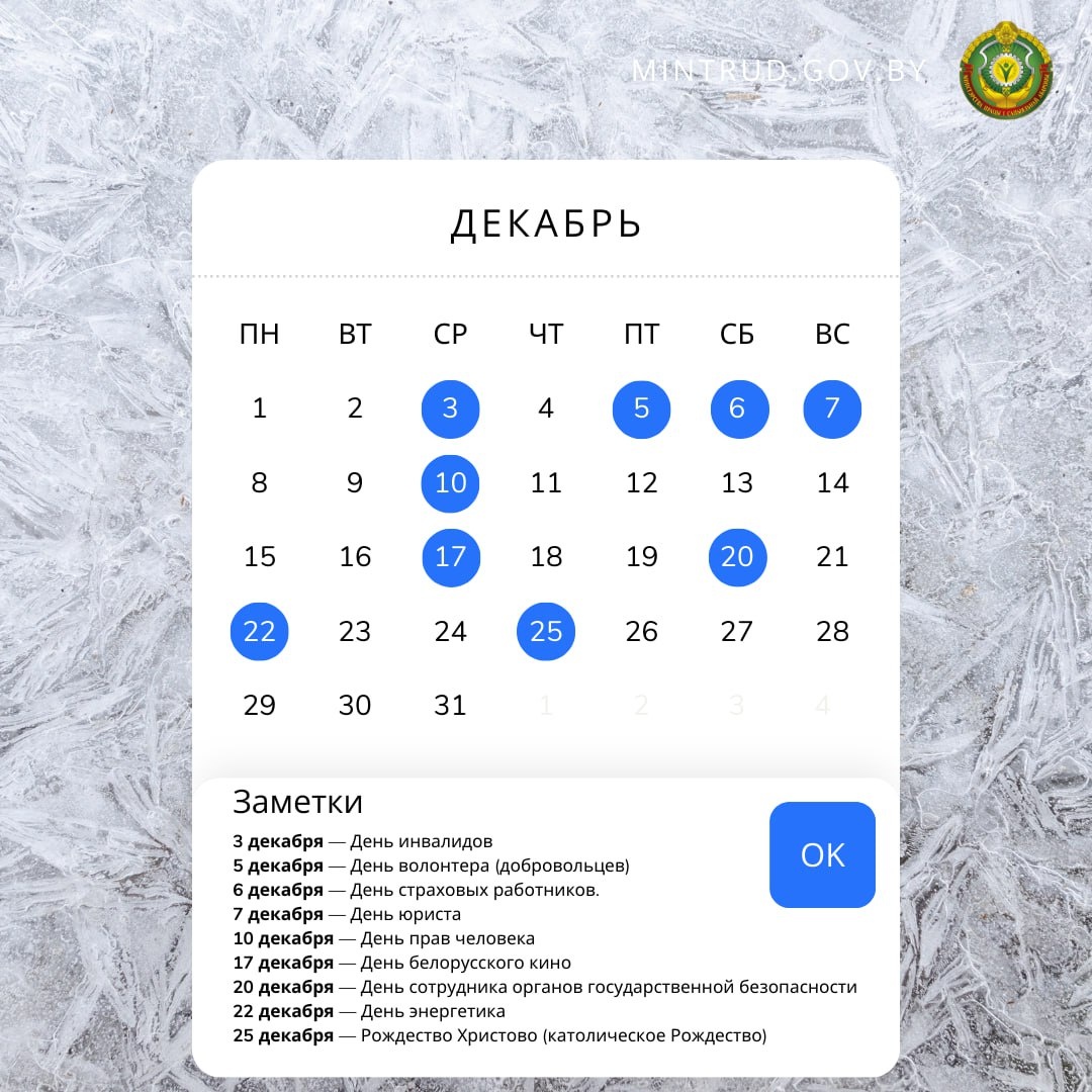 ❄️Декабрь — щедрый на праздники Делимся с вами календарем важных дат❄️ ▪️3 декабря — День инвалидов. ▪️5 декабря — День волонтера (добровольцев). ▪️10 декабря — День прав человека. ▪️ 17 декабря — День белорусского кино. 💼Профессиональные праздники ▪️6 декабря — День страховых работников. ▪️7 декабря — День юриста. ▪️20 декабря — День сотрудника органов государственной безопасности. ▪️22 декабря — День энергетика. ☦Религиозные праздники ▪️25 декабря — Рождество Христово (католическое Рождество). Кстати, рабочий день с 26 декабря (пятница) переносится на 20 декабря (суббота). ➡️ Таким образом, выходными днями будут: 25, 26, 27 и 28 декабря.