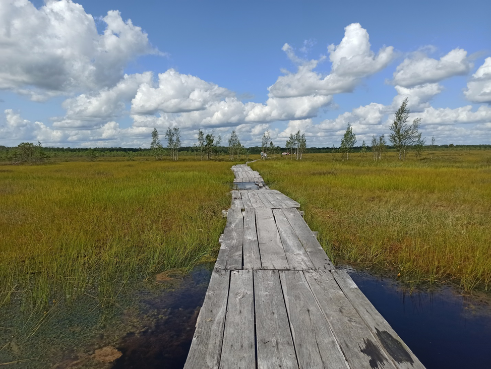 Как и большинство туристов, посещающих Ельню, я выбрала самый простой способ полюбоваться болотными видами – экотропу «Озеравки». Протяженность тропы 2,5 километра в одну сторону. Это четырехслойное деревянное покрытие, идти по которому достаточно удобно. В сухую погоду пройти здесь можно и в обычной обуви, но в дождливое время в некоторых местах тропа может быть немного подтоплена, поэтому резиновые сапоги придутся очень кстати.