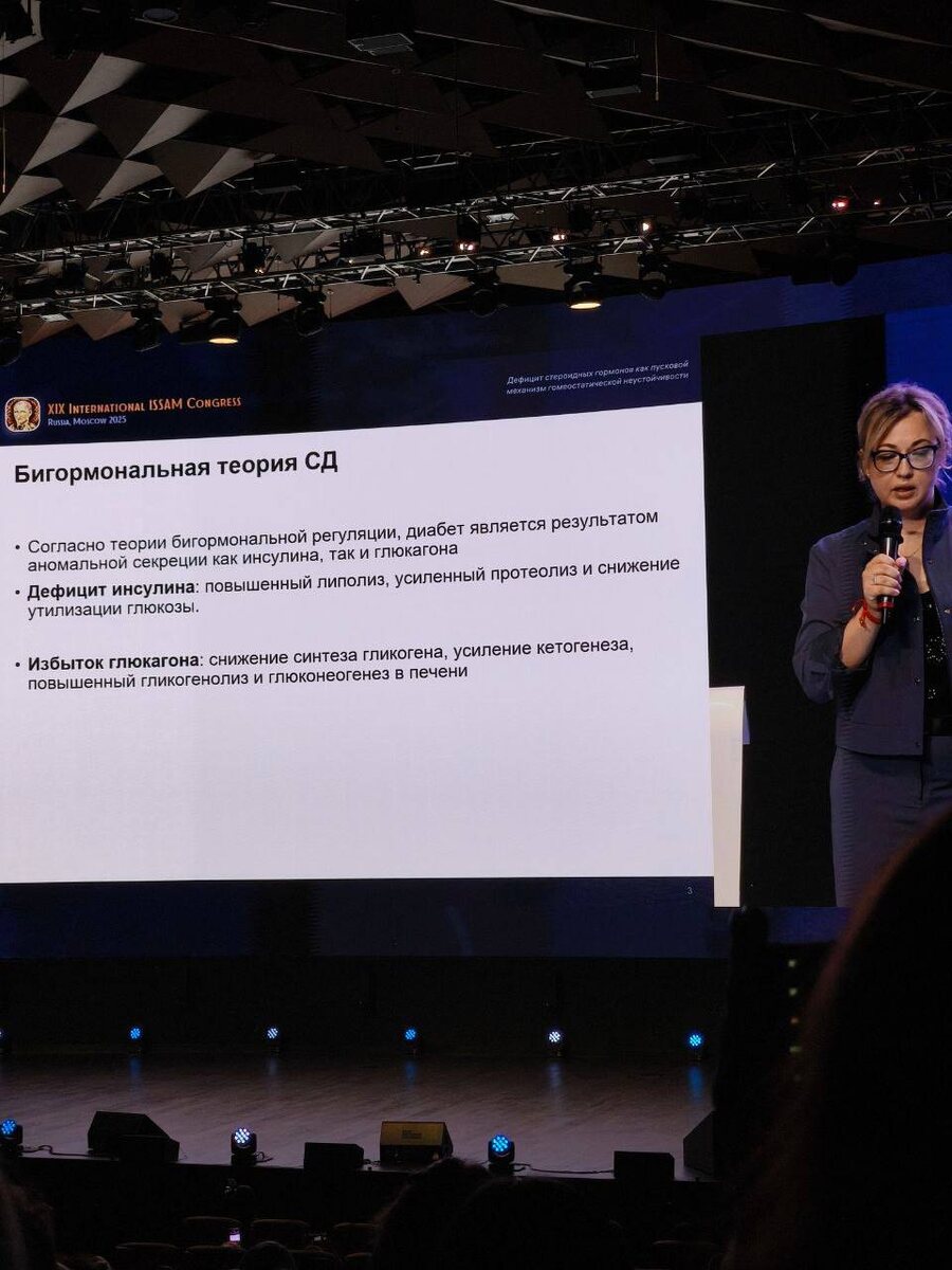 Про инсулинорезистентность знают все. А что вы знаете про глюкагонорезистентность? Сегодня на ISSAM этот вопрос впервые прозвучал так громко и так убедительно, что зал буквально замер. И подняла его один из сильнейших экспертов в стране по диабету — Свидерская Татьяна Анатольевна. То, что мы услышали, меняет представления о диабете и глюкозном гомеостазе: 1️⃣ Диабет — это не только про инсулин. Это нарушение двойной регуляции: инсулина и глюкагона. 2️⃣ Избыток глюкагона — ключевой драйвер гипергликемии натощак и гликемической вариабельности. 3️⃣ Гиперглюкагонемия — маркер диабета 2 типа, НАЖБП, ХБП и выраженного метаболического стресса. Что стоит за деятельностью альфа-клетки? 🔸 Нутриенты — Мощные стимуляторы: гипогликемия, аминокислоты (Арг, Ала), жирные кислоты — Супрессоры: гипергликемия 🔸 Паракринная регуляция — Соматостатин, ГПП-1, амилин, лептин — сильные ингибиторы — Инсулин подавляет глюкагон косвенно — через соматостатин 🔸 Нейрональная регуляция — И симпатическая,