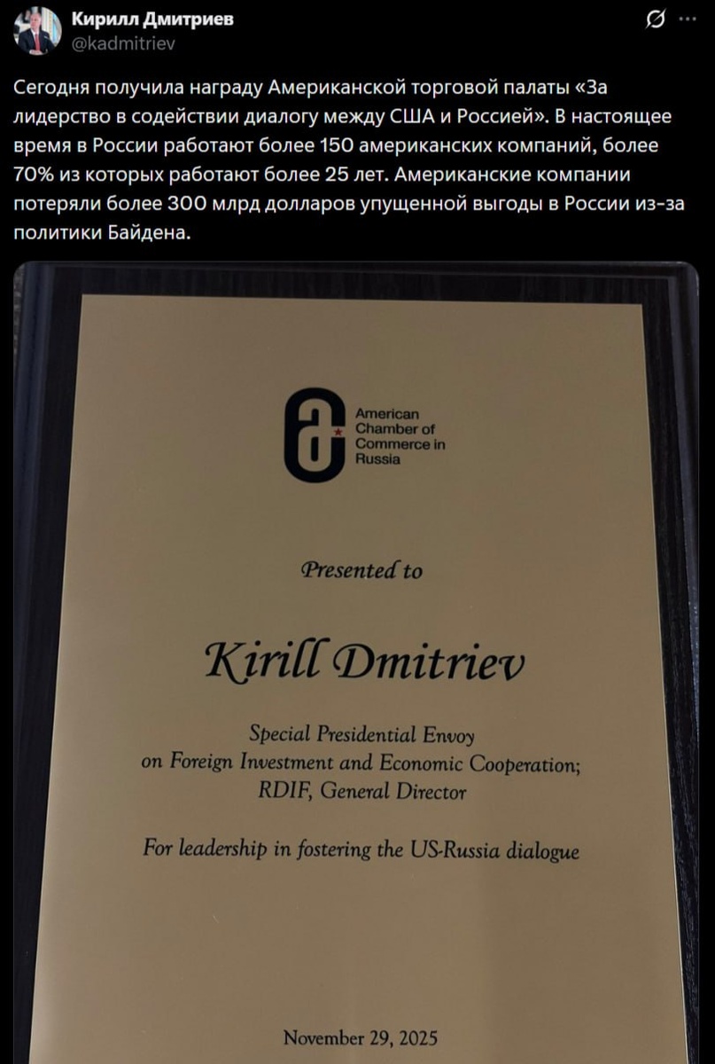 В ответ на пост Новость очень в тему моей публикации. МОСКВА, 30 ноя - РИА Новости. Глава РФПИ Кирилл Дмитриев сообщил, что получил награду от Торговой палаты США в России (AmCham) за "лидерство в укреплении диалога между США и Россией".