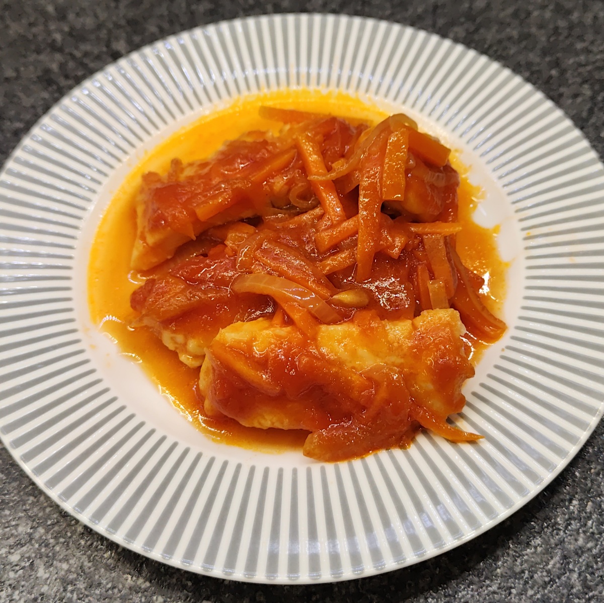 Эта холодная закуска знакома многим, эта вкуснятина была в каждой советской столовой. А если вы ещё не пробовали рыбу под маринадом из моркови и лука по классическому рецепту, обязательно попробуйте. Обычная белая рыба (минтай, треска,судак или хек) обретет совершенно новый вкус. Желательно готовить из филе, без костей .Вместо уксуса ,я взяла лимонный сок.Соус должен быть кисло- сладким, поэтому сами регулируйте сахаром, по своему вкусу. ИНГРЕДИЕНТЫ : Филе рыбы ( у меня треска)-700 го Лук -200 го Морковь- 200гр Масло растительное -50 мл Соль по вкусу Сахар - 5-10гр Томатная паста - 40гр Вода - 100мл Лимон -0,5 шт( среднего размера) Лавровый лист - 1шт ПРИГОТОВЛЕНИЕ : Морковь и лук почистить и помыть .Морковь порезать тонкой соломкой , а лук полукольцами . Филе рыбы порезать кусками. На сковороде разогрейте растительное масло, обжарьте до полуготовности сначала морковь, а затем — лук. Добавьте сахар, томатную пасту. Посолите и положите лавровый лист. Все перемешать , выдавить