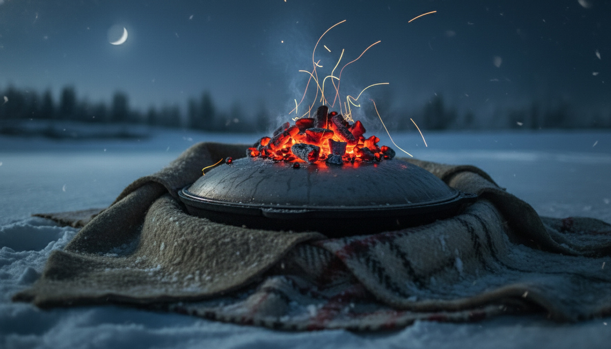 Совет по удержанию тепла: поддержите слабое тление 20–30 минут, затем вынесите в укрытие и укутайте в войлок/плед. На крышку можно положить горячие угли по кругу — это продлит тепло.