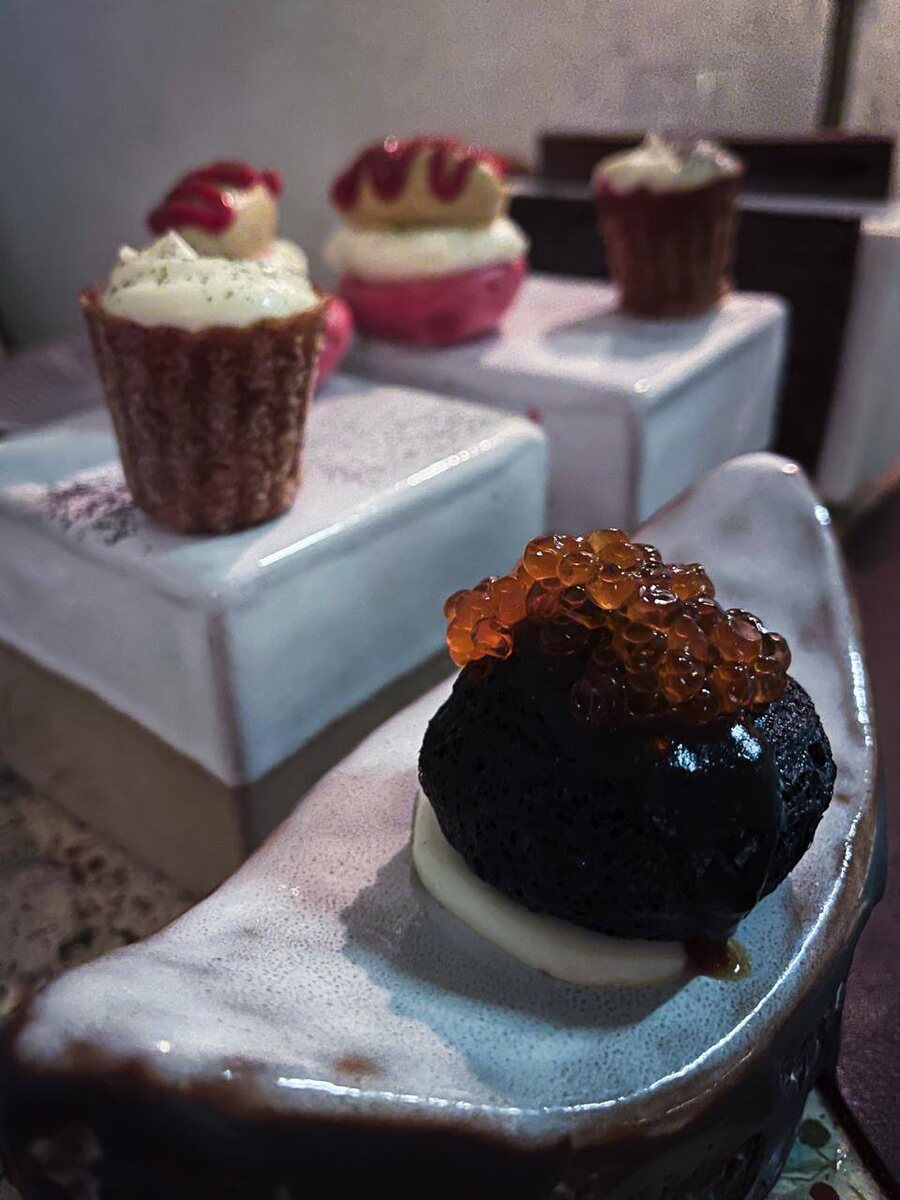 Про МонеМане О красоте и вкусноте ресторана МонеМане писали здесь, тогда мы приходили сюда в первый раз пробовать фирменный сет. Повторяться не будем. Сложились обстоятельства так, что в день нашей годовщины мы оказались в Минске и решили, что будет здорово зайти к ребятам и заценить их новый сет - Ассамбляж или эстетика опрокинутого стола. Не думайте, что меню в МонеМане исключительно сетовое, у них большой выбор одиночных блюд. Ассамбляж - это соединение разных частей/материалов во что-то единое полноценное, в композицию. Так и в МонеМане решили создать гастрономическую пьесу в 2 актах об изобразительных и динамических видах искусства, где каждый кусочек будет служить частью изысканной мозаики. Мы пришли немного пораньше, и, чтобы не заставлять скучать, нас угостили фирменной грушевой настойкой от бармена. Приятное начало. Дальше нас ожидало 8 подач: 🗿Первая подача - скульптура Чёрный пончик / начинка из лосося / красная икра - тёплая сбалансированная закуска, чуть хрустящая