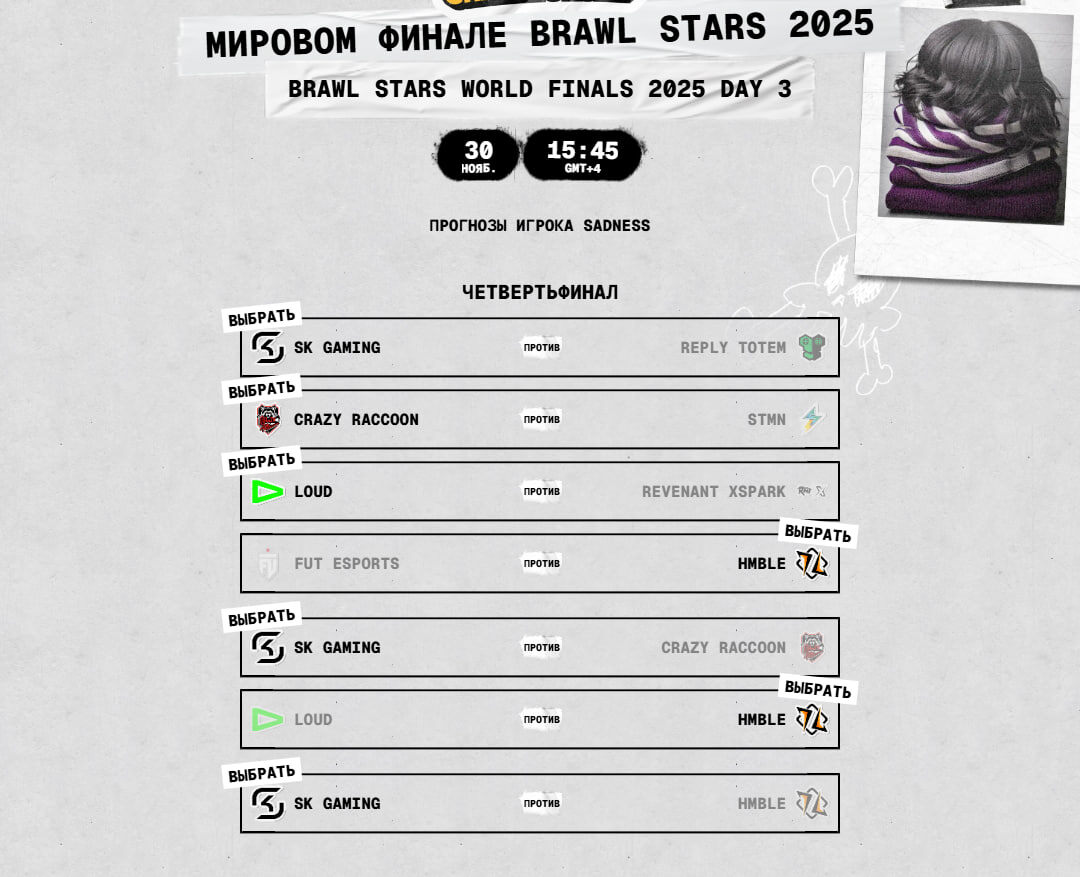 😄 Решающий день турнира Сегодня мы узнаем, кто станет новым чемпионом мира, всего пройдет 7 матчей, среди которых гранд-финал. Вы уже можете поставить предикты на сайте, ставьте по своему усмотрению, либо же подсмотрите у кого-нибудь другого. Верим в Reply Totem, но SK Gaming очень сильны, будет очень тяжело. ✅Новости по Clash Royale - ТЫК ✅Новости по Телеграмм подаркам, NFT - ТЫК Мир Supercell. Подписаться