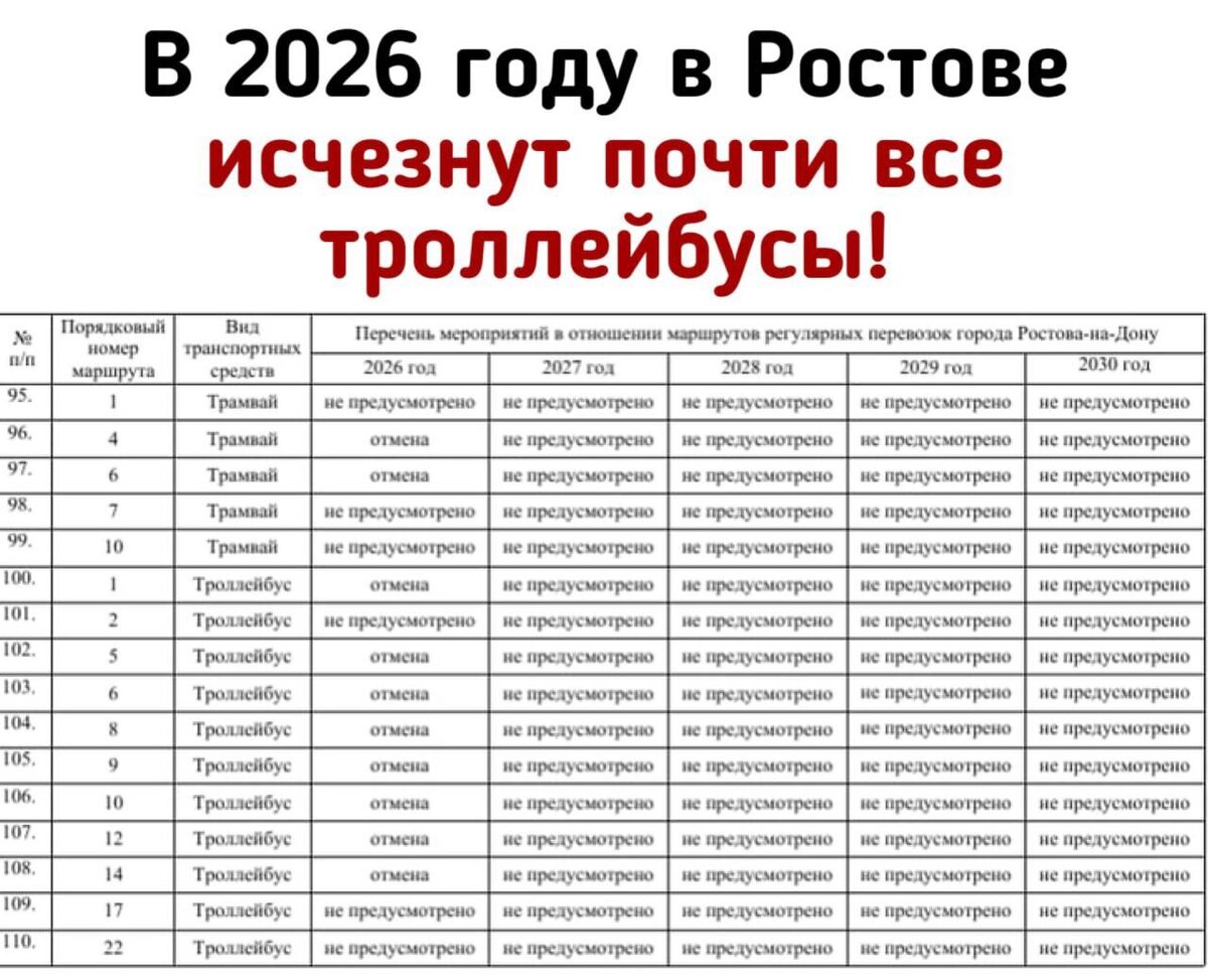 В Ростове отменят сразу несколько трамваев и почти все троллейбусы. Это следует из документа, опубликованного на сайте администрации. В нём сказано, что в 2026 году под нож пойдут троллейбусы №1, 5, 6, 8, 10, 12 и 14. Останутся только маршруты №2, 17 и 22. Кроме того, отменят два трамвая: №4 и 6. В документе основательно расписали, для чего всё это нужно — согласно тексту, изменения продиктованы необходимостью создания «условий, обеспечивающих удовлетворение спроса населения города Ростова-на-Дону на транспортные услуги, организацию транспортного обслуживания населения, соответствующего требованиям безопасности перевозок пассажиров и багажа автомобильным транспортом, повышение культуры и качества обслуживания». Вот только как «повышению культуры и качества обслуживания» поможет практически полностью уничтожить целую сеть транспорта в городе? 👉🏻Новости №1 в Ростове 💌Прислать новость/фото Ростов Папа теперь в Ⓜ️🅰️❌