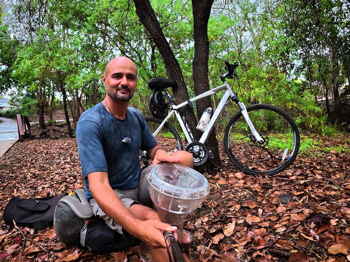 🚴♂️🥁 Вселенная, ну ты и шутишь… В позапрошлом посте я сказал, что все мои вещи помещаются в рюкзак. Вселенная услышала, почесала космический затылок и выдала гениальное решение: не надо выделяться… будь как все. И в итоге я в австралийских джунглях с крокодилами на велосипеде и с барабаном. Да, вы не ослышались. БАРАБАНОМ. Вот так я теперь продолжаю свой путь вокруг Земли на велосипеде и с шаманским бубном за плечом. Больше мои вещи не помещаются в один рюкзак! #Австралия
