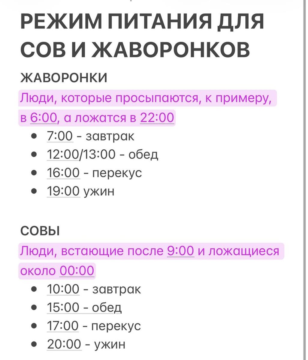 Давно стоит принимать во внимание тот факт, что все мы живем по своему распорядку. А значит и питание стоит подстраивать под свое время, а не наоборот. Выберите максимально удобное для себя время. Завтракать желательно через час после подъема ☝️ можно позже Если между завтраком и обедом большой перерыв и вы чувствуете сильный дискомфорт, добавьте второй перекус (будут указаны в меню)
