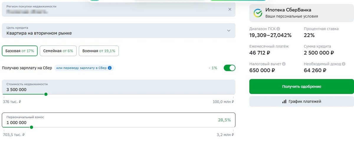 Честно говоря, сейчас расчет ипотеки на вторичку может довести до слез. Квартира ценой 3 500 000 р. в старом доме, во взносом 1 000 000 р., на тридцать лет, это платеж 46 712 р.