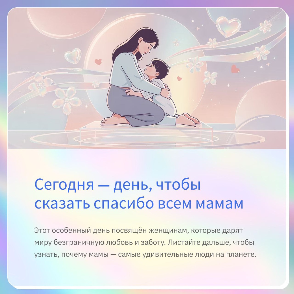 ✨❤️ Что это сегодня за волшебство? 👩🍼 Воздух будто подёрнут тёплой дымкой... 🌤️ То ли это вселенная настраивается на праздничный лад, то ли солнце, сделав очередной тайный шажок к лету, подмигнуло нам с небес , то ли сама природа напоминает: сегодня День матери! 🌸🤱 И раз уж сам мир даёт нам такой знак, давайте хором скажем спасибо нашим мамам. 💜 За их святую выдержку в ответ на наши шедевры вроде: «Идите везде сами, мне не интересно» 👀, и вечное «Мы долго ещё?» ⏳ Вы терпели не только нас, но и наши самые немыслимые капризы. И за это — низкий поклон и самые тёплые объятия! 🫂 Мы вас любим! Вы тоже, не сомневаемся - ❤️!