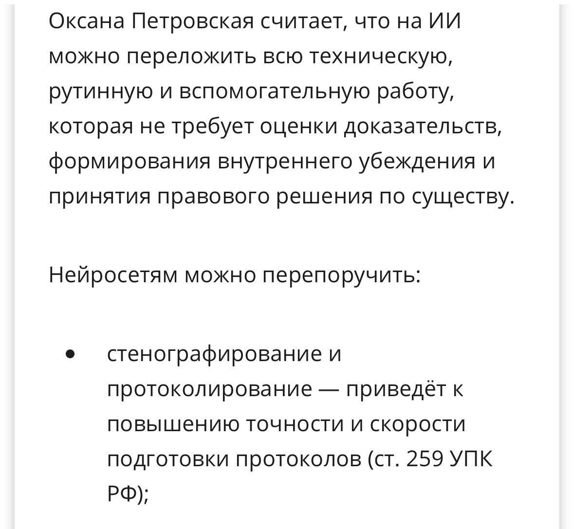 Если хочется почитать в выходной, то рекомендую статью, где я и другие эксперты рассуждаем о возможностях использования технологий ИИ в судебной системе. Технология не может заменить пока человека, но в некоторых сферах может помочь и оптимизировать процессы. https://legalacademy.ru/sphere/post/iskusstvennyi-intellekt-vmesto-sudi-chto-delat-esli-prigovor-pishet-neiroset #петровскаявсми