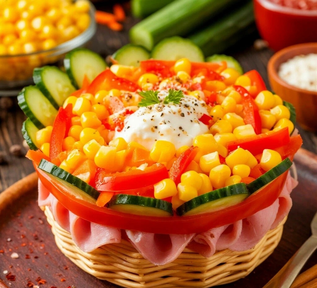 САЛАТ: "РАДУГА В КОРЗИНКЕ" Мяу, мои пушительные любители ярких вкусов! 😺🌈 А вот и салат, который своим видом поднимет настроение даже в самое пасмурное воскресенье! Ветчина, сыр, хрустящие овощи — все, как мы любим! Готовится за 10 минут — больше времени на отдых! 🥗 САЛАТ: "РАДУГА В КОРЗИНКЕ" ИНГРЕДИЕНТЫ (на 2-3 порции): 🧾 · Ветчина: 150 г · Сыр твердый: 100 г · Огурец свежий: 1 шт. (150 г) · Перец сладкий: 1/2 шт. (80 г) · Морковь по-корейски: 100 g · Кукуруза консервированная: 150 г · Майонез: 2-3 ст.л. · Соль, перец: по вкусу ВРЕМЯ ПРИГОТОВЛЕНИЯ: ⏰ 10 минут СЛОЖНОСТЬ:🐾 Проще некуда ПОШАГОВАЯ ИНСТРУКЦИЯ: 👩🍳 1. Ветчину нарежьте соломкой. Сыр натрите на крупной терке. 🥓🧀 2. Огурец и сладкий перец вымойте и нарежьте соломкой. 🥒🫑 3. Сложите в миску все ингредиенты: ветчину, сыр, огурец, перец, морковь по-корейски и кукурузу (слив жидкость). 🌽 4. Заправьте майонезом, посолите, поперчите и тщательно перемешайте. 5. Подавайте сразу. 👌 ПОЧЕМУ ЭТО ШЕДЕВР? 🎨 Этот салат— н
