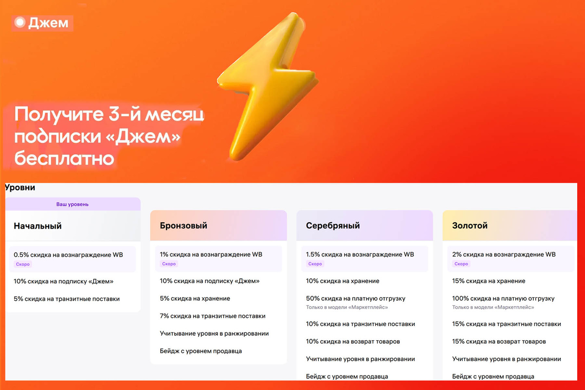 «Джем» ускоряет рост уровня продавца, а уровни дают скидки на хранение, транзит, возвраты и платную отгрузку. Плюс бесплатный третий месяц. Плюс рост органики за счёт предпросмотра. Если выручка от 1.5 млн рублей – подписка окупается сам