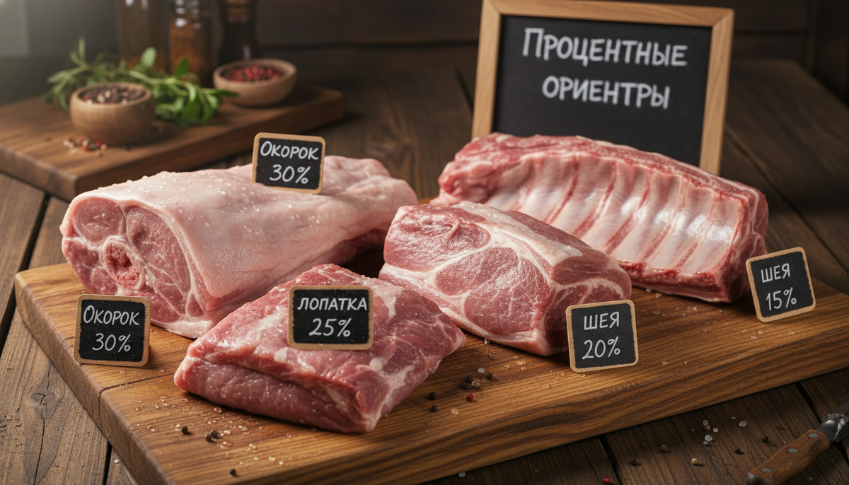 - Лопатка (передняя часть) — 12–18%. Подходит для тушения, фарша и колбас.