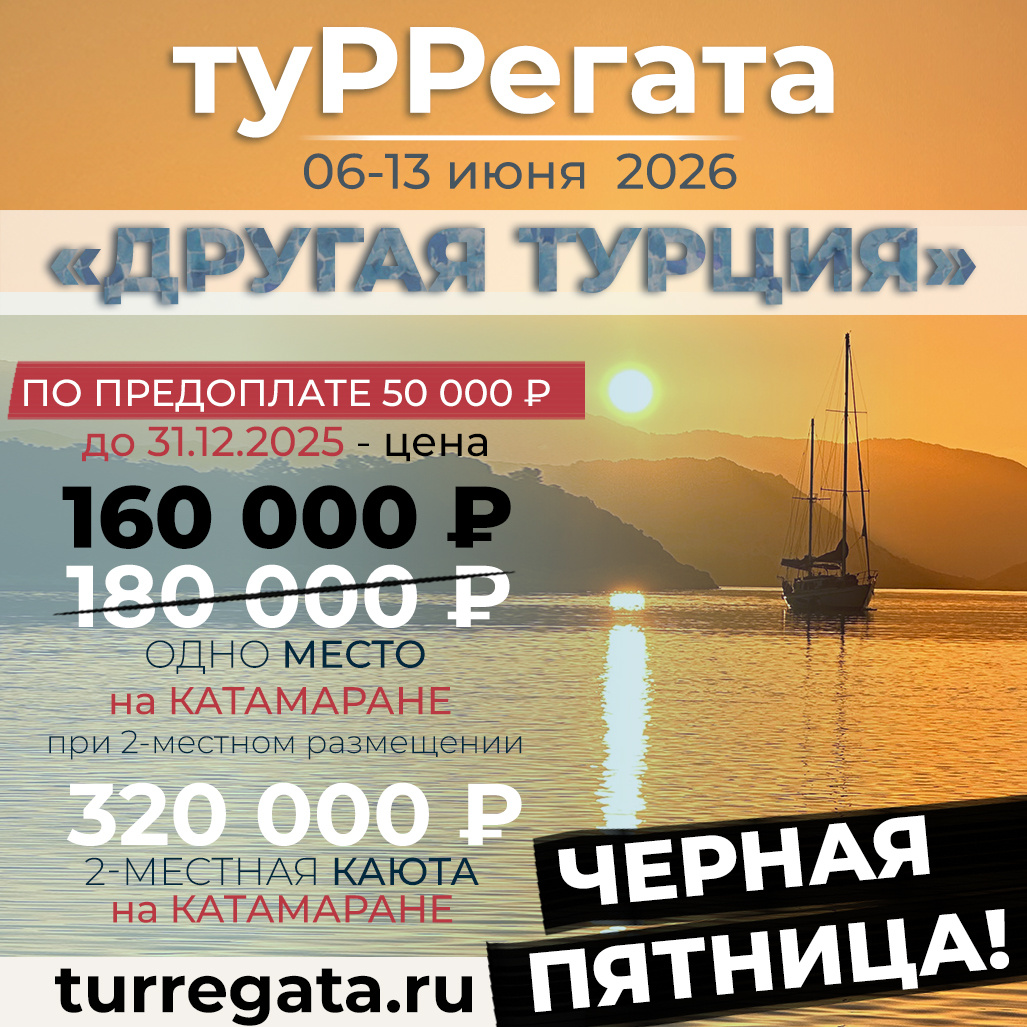 Друзья дорогие! У туРРегаты - "чёрная пятница", которая будет длится до конца года: теперь недельная программа на катамаране летом 2026-года стоит 160 000 рублей! На катамаране!!! Надо брать. Напоминаю, что июнь - отличное время для Турции: воздух +25, вода +20. Мы ходим под парусом, смотрим живописный остров Гемилер, уникальную бухту Олюдениз, горные массивы Баба-Дага, древний Фетхие, уникальный Дальян... Живём на борту наших огромных катамаранов, много гуляя по городам и деревушкам. Любуемся живописными горами, изумрудными бухтами и очень много купаемся... И, конечно, будет очень вкусно. От обилия закусок-мезе, что подают турки в начале трапезы, кругом идёт голова. А уж барашек в тандыре - пальчики оближешь! Вот подробная программа: turregata.ru/turkey4. Тут же - форма для регистрации. #другаятурция #турциянакатамаране #туррегата #зоткингид #spbsailclub
