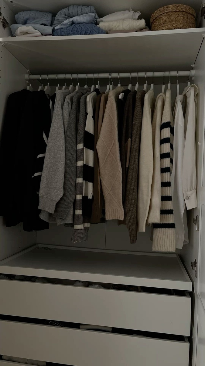 Когда вещей много, они неизбежно цепляются, мнутся, падают, и каждый раз, когда ты открываешь шкаф, видишь визуальный шум. Это вызывает стресс, даже если ты его не осознаёшь. Из-за этого утро ощущается «комом»: ты не можешь расслабиться, потому что пространство давит на глаз. Когда в шкафу только то, что тебе нужно, там физически нечему создавать хаос. Полки выглядят аккуратно без усилий, и ты не тратишь время на мелкие корректировки.