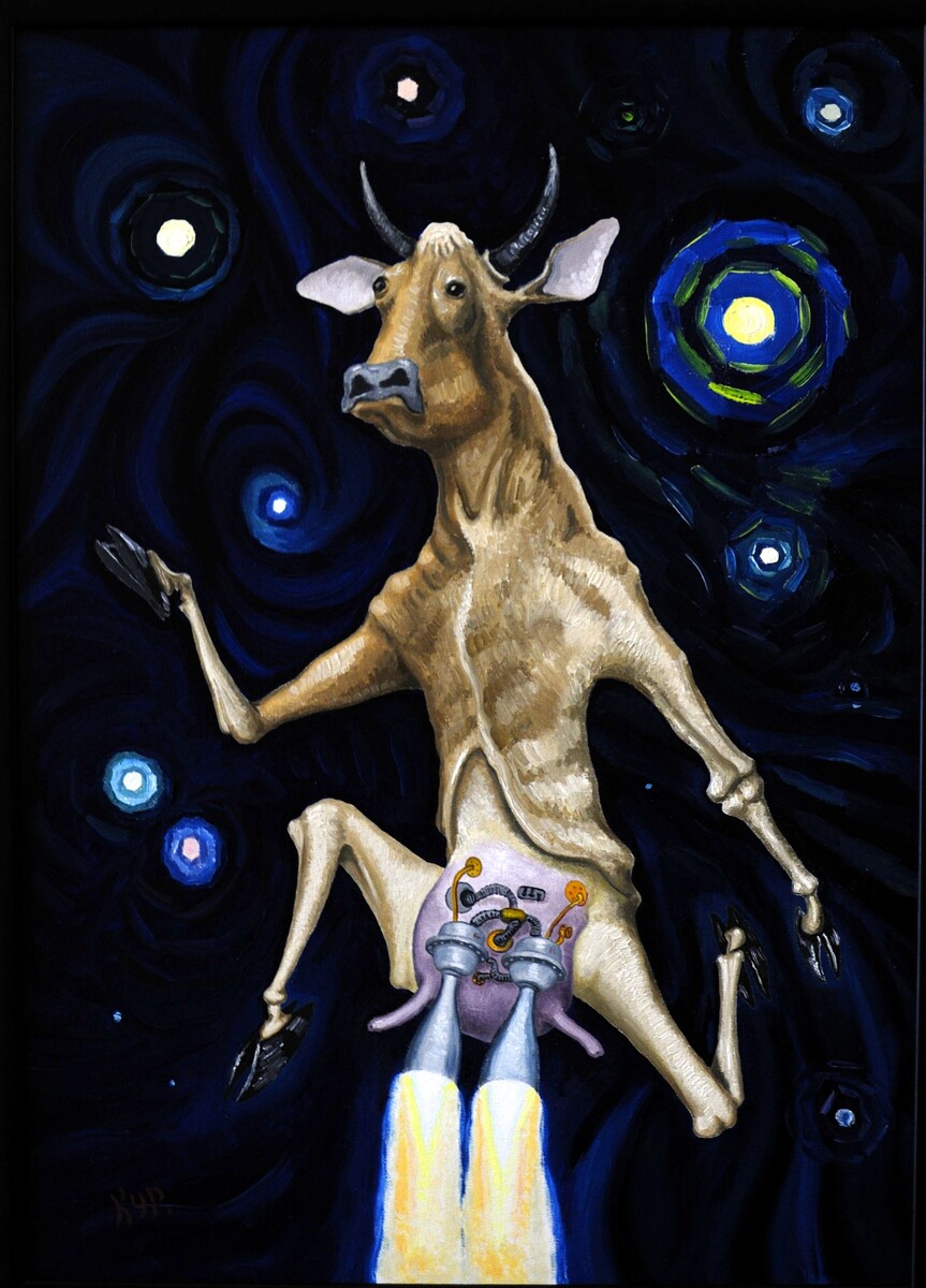 На бескрайних просторах космоса, где звезды мерцают, словно далекие маяки, а галактики раскинулись, как гигантские вихри света, произошло нечто невероятное. В один из таких моментов, когда тишина и спокойствие царили в этом безмолвном мире, появился он — космический странник, похожий на мифического быка, но с телом, покрытым загадочными узорами и символами.
