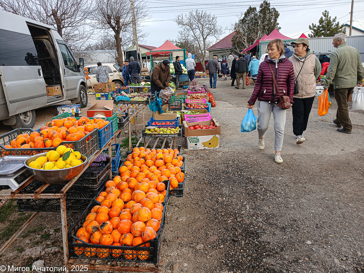 На рынке у нас изобилие хурмы. Она растёт и в Старом Крыму, и в окрестных сёлах. В нашем саду только почему-то не хочет. Мы сажали два дерева, привезенные из питомника. Первый саженец прожил всего год. Второй продержался дольше, я спилил его год назад. За всё время ни одной зрелой хурмы мы на дереве не увидели. Плоды завязывались и в немалом количестве, но все осыпались зелёными. Так что покупаем на рынке, раз уж хурмоводы из нас не получились. Цена на хурму начинается от 80-90 рублей, а заканчивается на 130. Хурма отличная, спелая и сладкая. Разных сортов, цветов и размеров. И не вяжет. Так что эта замечательная реклама (на снимке внизу) - чистая правда. Вообще из всех видов местной хурмы, часто мелкого размера и, казалось бы, невзрачных на вид, ни разу мне не попадались такие, что вяжут рот. А вот привозная хурма, импортная, крупная и красивая, с острой пипкой на конце (как на фото внизу) нередко страдает таким недостатком. Часто её приходится класть в морозилку перед употреблением