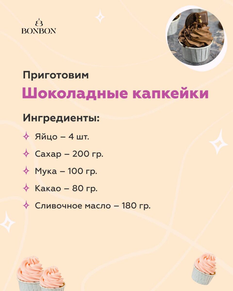 Готовим шоколадные капкейки вместе с BonbonSchool!🧁 Смотрите пошаговый рецепт в карусели ⬆️, а если у вас есть вопросы по процессу приготовления — пишите в комментариях ⬇️ Ещё больше рецептов и полноценных курсов на сайте BonbonSchool