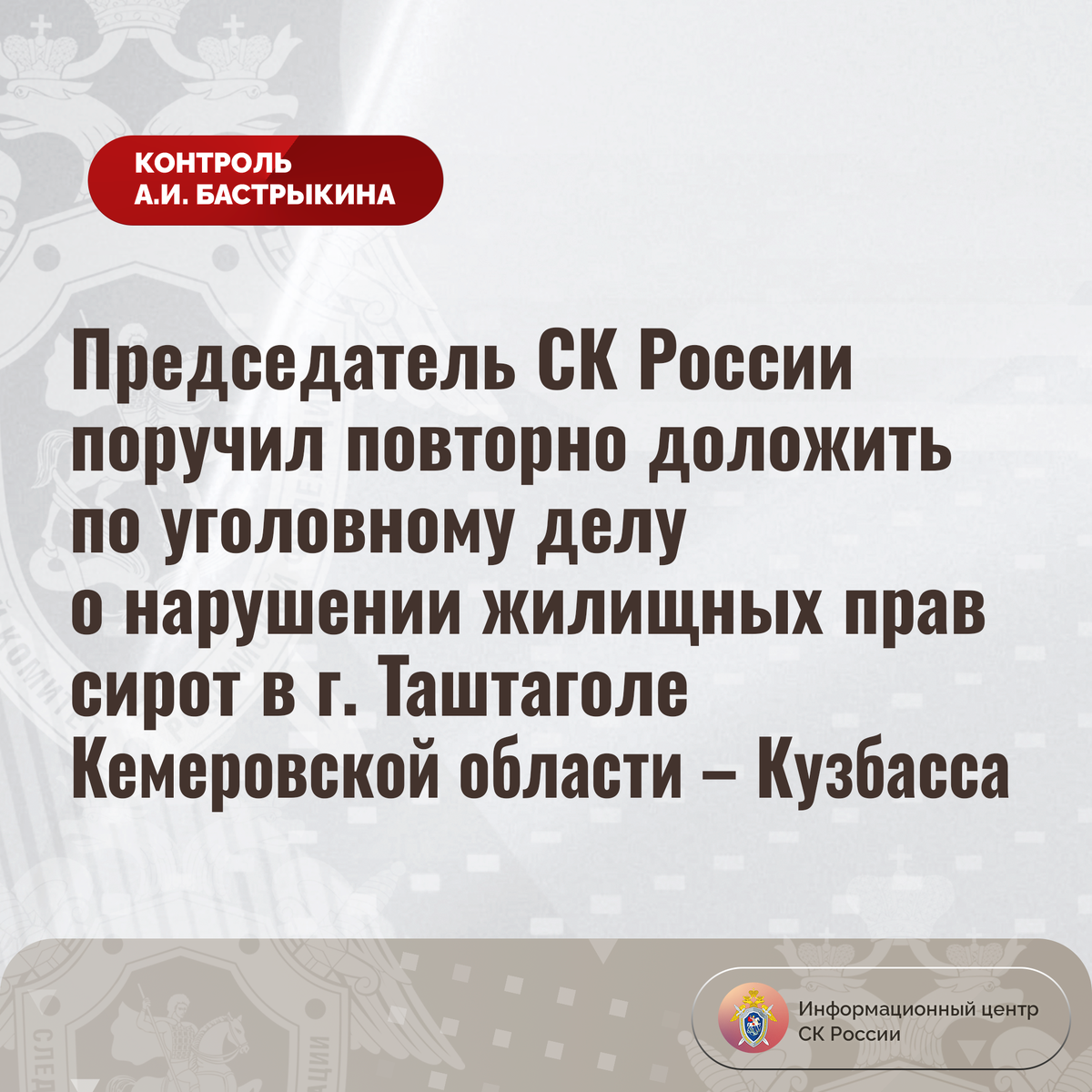 Председатель СК России поручил повторно доложить по уголовному делу о нарушении жилищных прав сирот в г. Таштаголе Кемеровской области – Кузбасса В адрес Председателя СК России А.И. Бастрыкина через Информационный центр поступили обращения по вопросу нарушения жилищных прав сирот в городе Таштаголе Кемеровской области – Кузбасса. В 2021 гражданам льготной категории предоставлены квартиры в трех новостройках на улице Коммунистической. Однако в 2023 году из-за несоответствия технической документации по решению суда строения признаны непригодными для проживания, а заключенные с сиротами соглашения - незаконными. При этом в соответствии с судебным решением заявители должны быть обеспечены другой благоустроенной недвижимостью. До настоящего времени решение не исполнено, ввиду чего обратившиеся вынуждены арендовать жилые помещения за свой счет, что для них финансово затруднительно. Обращения в различные инстанции результатов не принесли. В СУ СК России по Кемеровской области – Кузбассу рассл