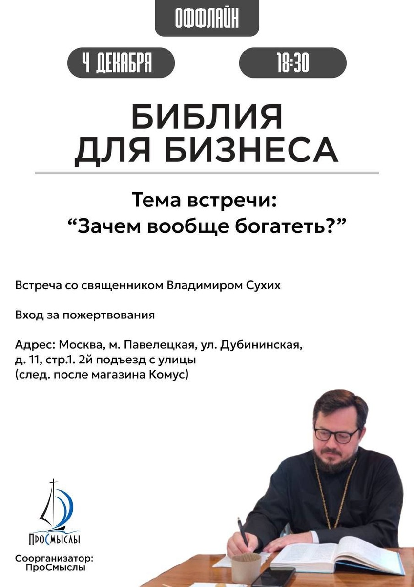 Живая встреча из цикла "Библия для Бизнеса" для предпринимателей, руководителей и других деловых людей 🎙️ Тема встречи: Зачем вообще богатеть? Встреча будет интересна тем, кто интересуется вопросами духовного роста и развитием своего дела, а так же ищет среду, чтобы вести дела по-православному. 🗓️ 04.12.2025 г. с 18:30 до 21:00 📌 м. Павелецкая, ул. Дубининская, д. 11, стр. 1. 💬 Священник Владимир Сухих - настоятель храма Дмитрия Донского в г. Софрино о. Владимир имеет светское экономическое образование, больше года ведёт просветительские беседы с предпринимателями в рамках проекта "Библия для Бизнеса" и более 12 лет ведёт библейский кружок для прихожан. Регистрация на встречу Вход на встречу за пожертвование - 500 рублей. 📖 На встрече разберем отрывки из Евангелия, которые помогают разобраться: Нужно ли христианину вообще стремиться к богатству и если нужно, то зачем? Соорганизатор встречи: проект ПроСмыслы. Присоединяйтесь!