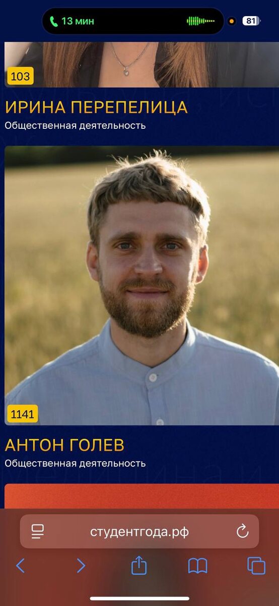 Выражаю огромную благодарность каждому, кто отдал свой голос за меня в конкурсе "Лучший студент года"! Я занял второе место с 1141 голосом, уступив Лизе Розенко, которая опередила меня на 170 голосов👏 Это было технически сложное голосование с регистрацией через Vk и Tg. Неделя голосования была интересной!) В конкурсе два победителя в каждой номинации, и в нём не оцениваются реальные достижения, а лишь количество голосов, поэтому каждый мог) Поздравляю всех победителей и еще раз благодарю за поддержку!