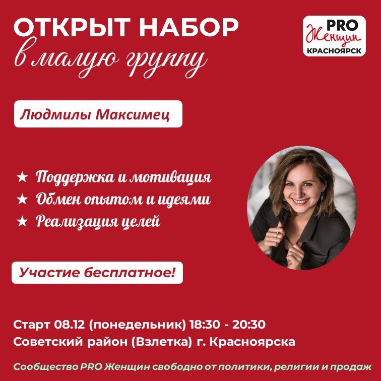🔔 ОТКРЫТ НАБОР В МАЛУЮ ГРУППУ «ЖЕНСКАЯ ЛИГА» Участие бесплатное 🌿 На связи лидер сообщества PRO Женщин Людмила Максимец: «Приглашаю в группу тех, кто хочет найти поддержку, вдохновение и тёплую компанию В группе мы: 🫶 Поддерживаем друг друга, чтобы не останавливаться и дойти до цели 🫶 Радуемся каждому успеху, даже самым маленьким, вместе 🫶 Делимся собственным опытом и мотивацией Что вы сможете на встречах: ⭐️ Получить поддержку и мотивацию ⭐️ Определить свою цель в актуальной для вас сфере ⭐️ Сформировать намерение на изменение ⭐️ Быть в пространстве, где безопасно быть собою «Влюбитесь в себя. И мир полюбит вас в ответ» 🌺 ✔ Старт 8 декабря 18:30-20:30 ✔ Встречи по понедельникам ОФФЛАЙН ✔ Еженедельно, всего 8 встреч ✔ Советский район (Взлётка) г.Красноярска ✍️ Если хотите присоединиться или задать вопрос, пишите лидеру группы в лс ➡️ t.me/Lydmila_Maximez ❗️❗️❗️ Это не терапевтическая или психологическая группа, а группа поддержки, в которой участницы поделятся с вами свои