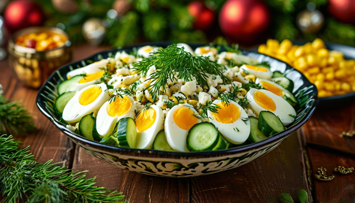 В большой миске соедините яйца, сыр и огурцы. Добавьте кукурузу, предварительно слив жидкость. Посыпьте салат укропом. 3. Приготовьте заправку: