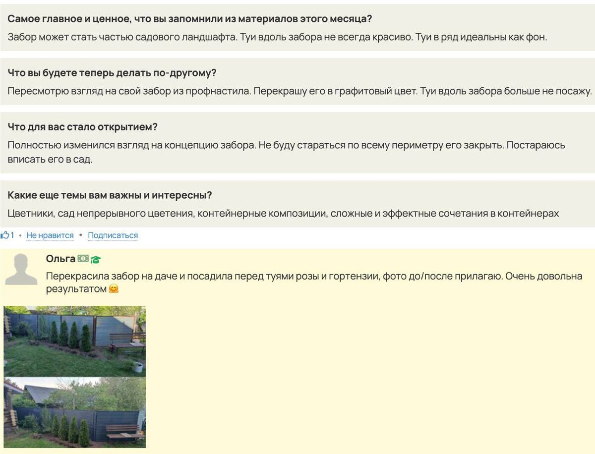 Как одна лекция помогла увидеть забор по-новому Иногда в саду главное изменение происходит не с растениями, а с тем, как мы смотрим на уже знакомые вещи. Подписчица Библиотеки, Ольга, поделилась результатом после материалов месяца — и это прекрасный пример, как знания в Библиотеке превращаются в реальные шаги. Ольга решила попробовать то, о чём мы говорили в материалах про профнастил: — перекрасила забор в графитовый цвет, — отказалась от идеи «закрыть всё туями», — добавила розы и гортензии, чтобы сделать линию посадки живой и динамичной круглый год На всё ушло несколько часов, а ощущение от места изменилось намного сильнее, чем она ожидала. Графитовый цвет стал мягким, спокойным фоном.. Туи стали выглядеть спокойнее, не «выступать» на металле. Появилась глубина, аккуратность, лёгкость. Даже несмотря на то, что растения еще молодые — пространство стало дышать. Таких историй в Библиотеке много. Кто-то меняет одну деталь — и пропадает ощущение, что «тут всё не так». Кто-то в чате