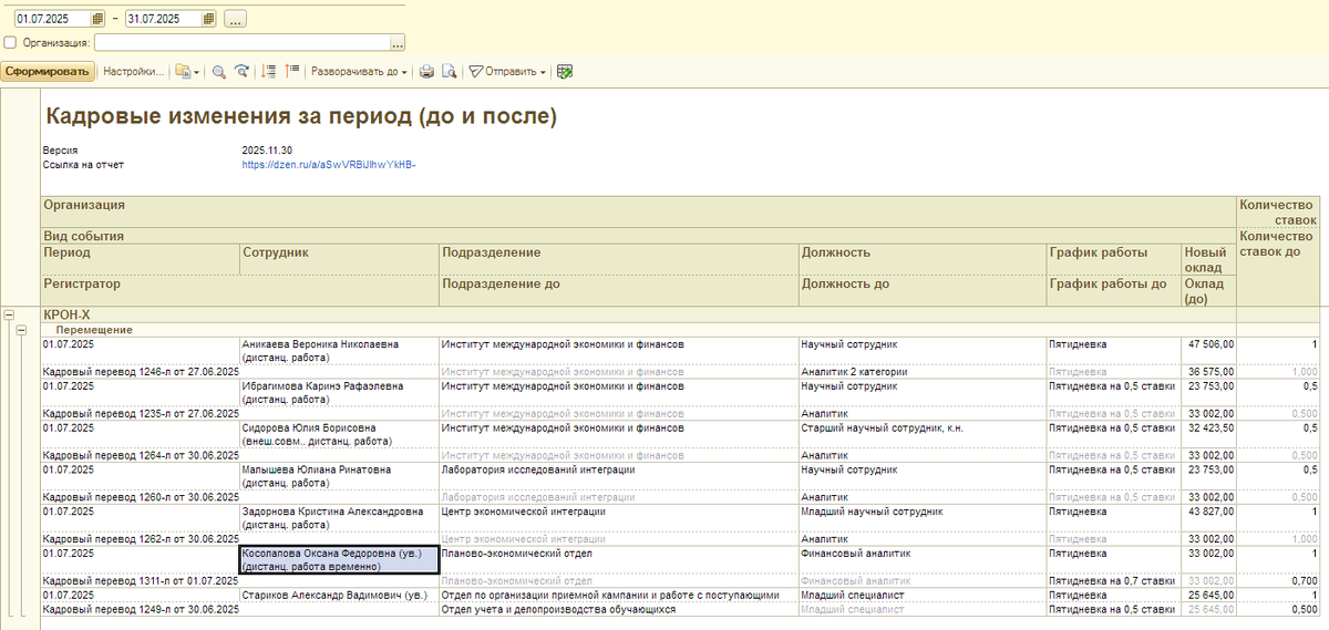 Отчет показывает какие основные данные изменились после кадрового перевода. К основным данным относятся Если данные не изменились, то шрифт у "данные до" более светлый. По умолчанию стоит отбор кадрового события "Перемещение". Можно его отключить, но в этом случае часть данных будут пустые. Например для приема "данные до" отсутствуют. А для увольнения и до и после будут одинаковые. В любом случае отчет - это основа для вашего вариант. Можете изменить его под себя. Скачать настройку можно по ссылке ее надо загрузить в универсальный отчет (два раза)