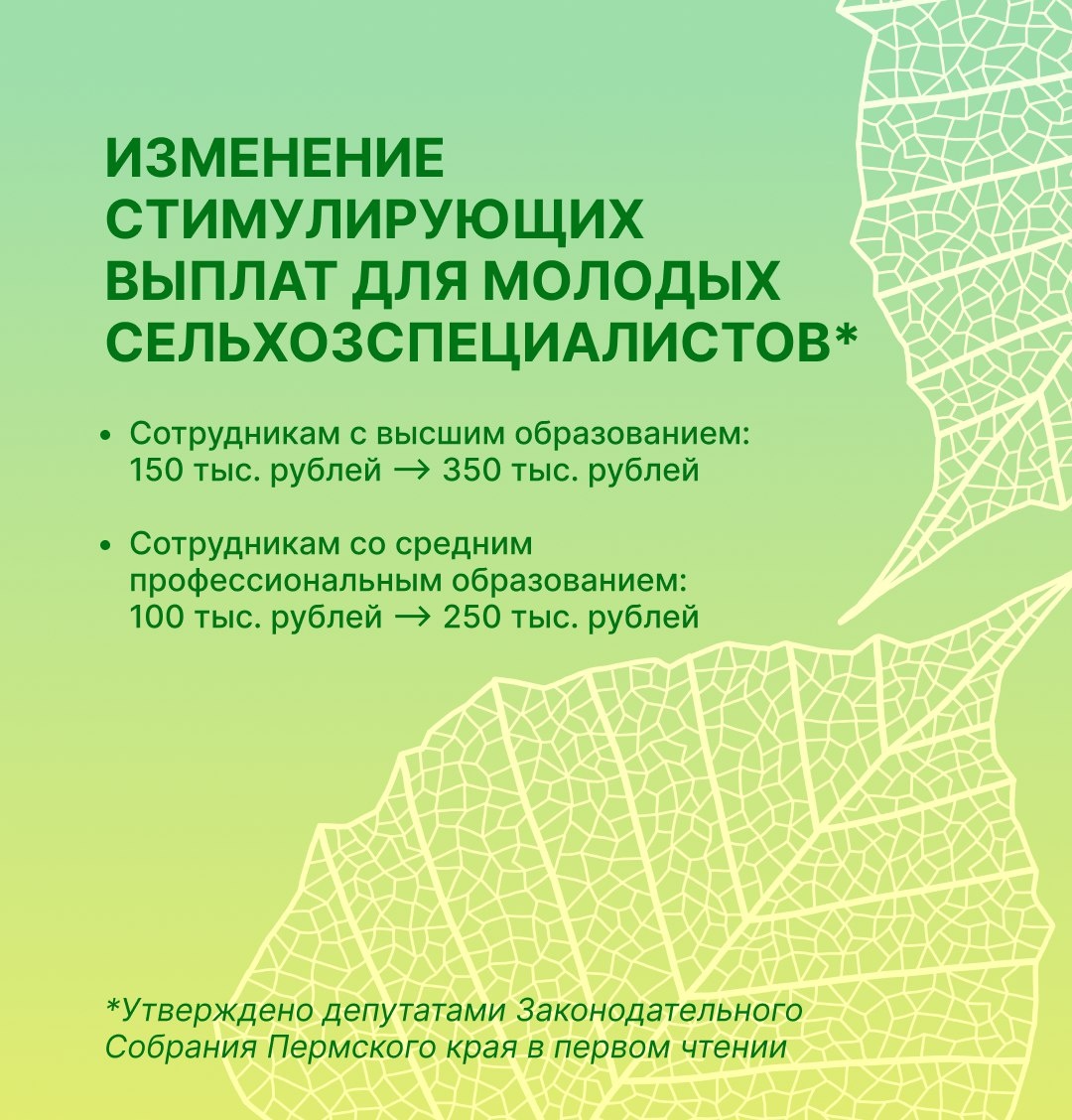 ⬆️ Молодые сельхозспециалисты Пермского края получат повышенные выплаты В регионе планируют существенно увеличить финансовую поддержку молодых специалистов, работающих в сельском хозяйстве. Депутаты ЗакСобрания одобрили инициативу в первом чтении. 🔹Для выпускников вузов размер стимулирующей выплаты вырастет с 150 тыс. до 350 тыс. рублей; 🔹Для специалистов со средним профобразованием — с 100 тыс. до 250 тыс. рублей. ❗️Исключено условие об обязательной отработке в сельхозорганизации в течение трех лет после заключения договора o предоставлении стимулирующей выплаты. Отметим, что стимулирующая выплата предоставляется специалистам, уже получившим единовременную выплату и отработавшим в сельскохозяйственной организации три года. Инициатива выдвинута губернатором Пермского края Дмитрием Махониным и направлена на укрепление кадрового потенциала сельского хозяйства региона.