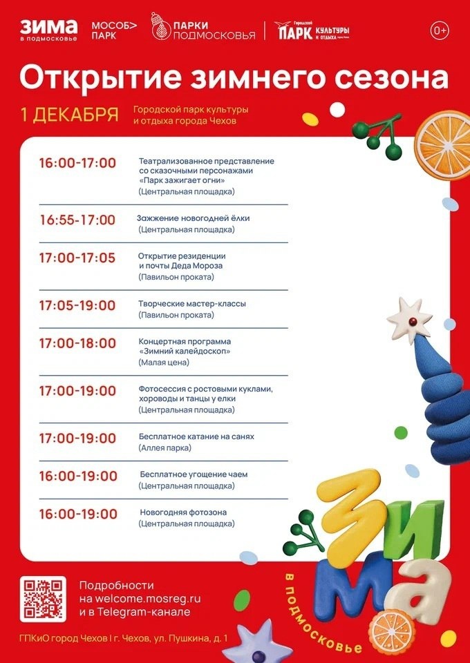 ✨ В Городском парке ОТКРЫТИЕ ЗИМНЕГО СЕЗОНА❄️ 👉16:00 - 17:00 Театрализованное представление 👉16:55 - 17:00 Зажжение новогодней ёлки 👉17:00 - 17:05 Открытие резиденции и почты Деда Мороза (павильон проката) 👉17:05 - 19:00 Мастер-классы (павильон проката) 👉17:00 - 18:00 Концертная программа (малая сцена) 👉17:00 - 19:00 Фотосессия с ростовыми куклами, танцы у ёлки 👉17:00 - 19:00 Бесплатное катание на санях 👉16:00 - 19:00 Бесплатный чай, новогодняя фотозона 🚫 Возраст: 0+ 📆 01.12.2025 🕛 16:00 🏢 Городской парк культуры и отдыха 📍 г. Чехов, ул. Пушкина, д.1 🪙 Вход свободный❗️ ⭐Поддержать канал голосом ✅ Мероприятия Чехов https://dzen.ru/id/66cc4b48e9ef144699238a51 http://vk.com/chekhov_events http://dzen.ru/chekhov_events