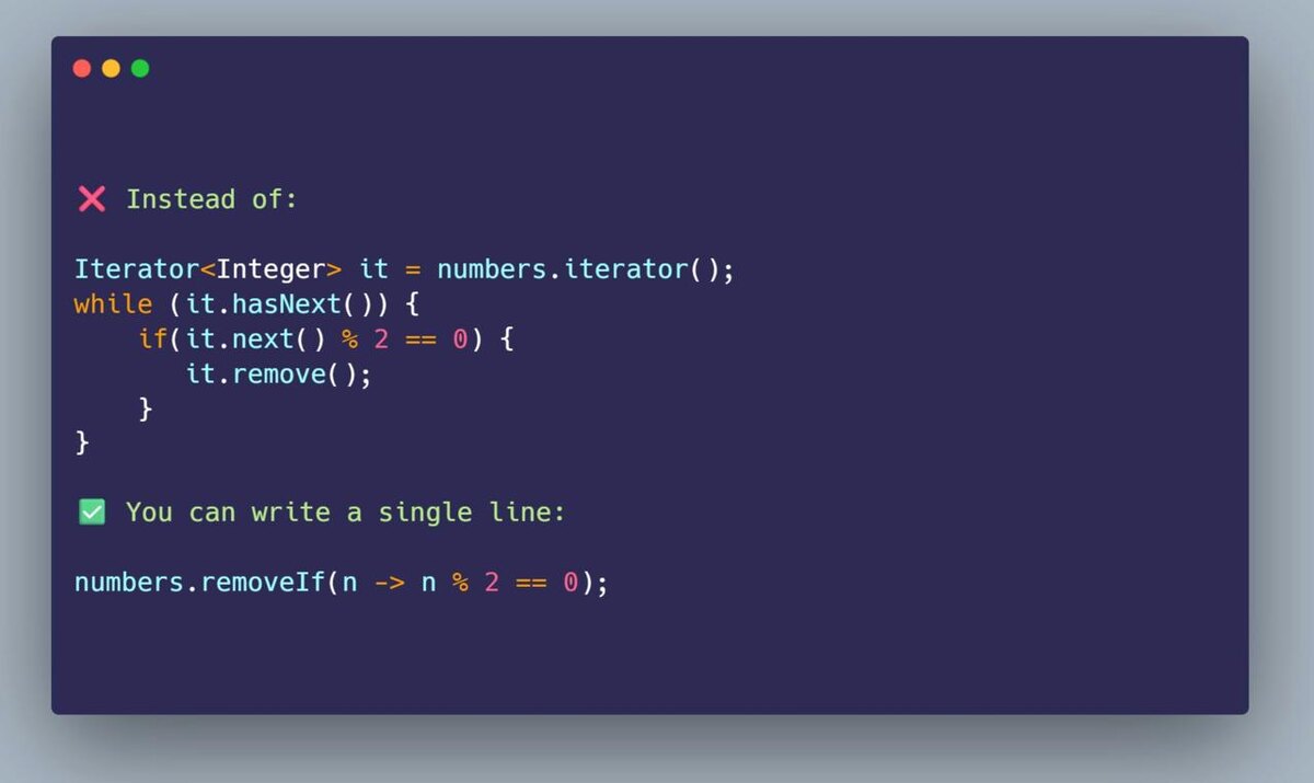 💡 Java совет: начиная с Java 8, можно использовать List.removeIf(<predicate>), чтобы очищать коллекции в одну строку