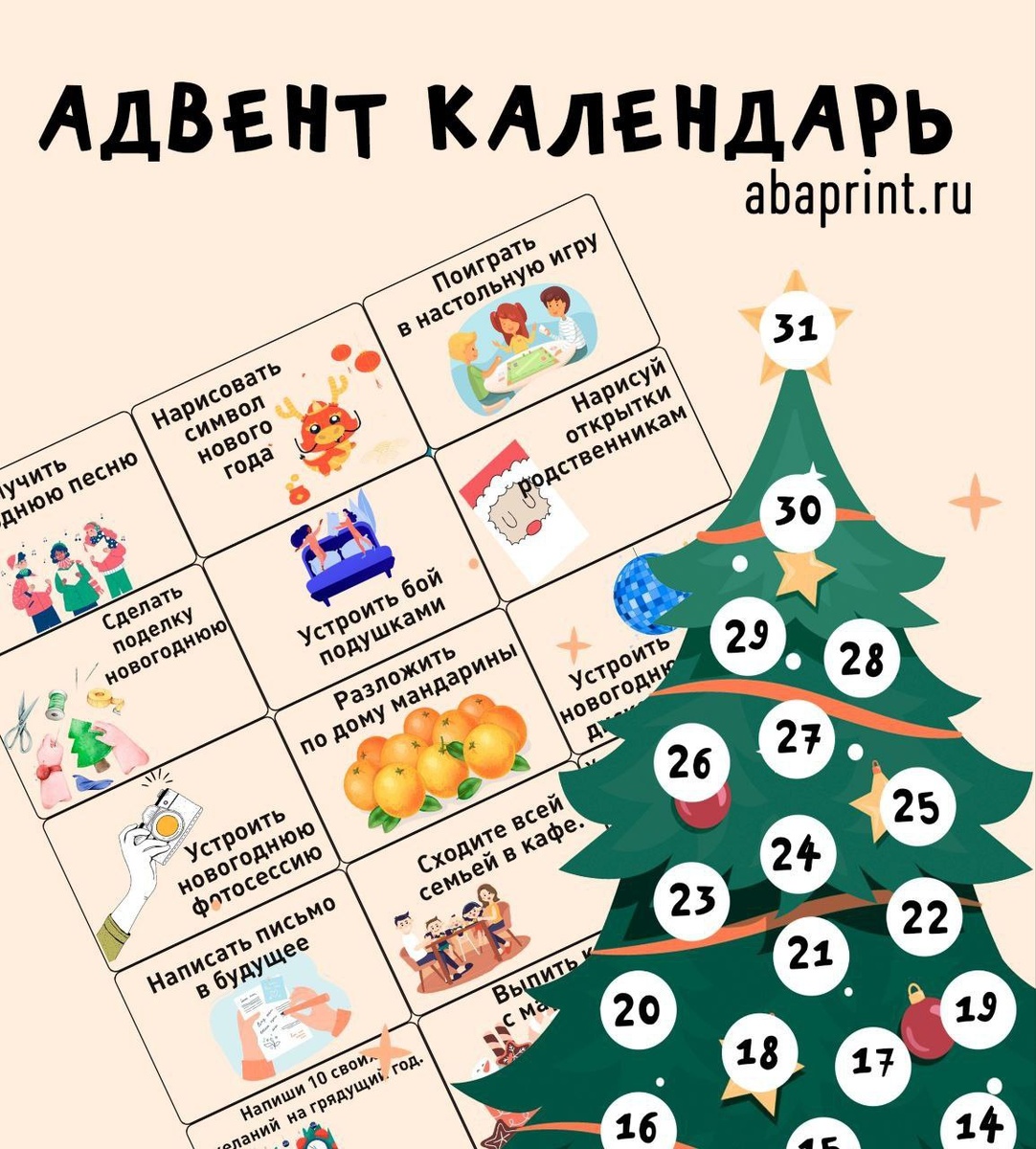 👣👣👣👣 Уже завтра зима вступит в свои права — а значит,уже пора наполнять дом сказкой и атмосферой праздника и чуда🌲 🎁В этом вам поможет наш Адвент-календарь из 30 уютных, тёплых и праздничных заданий— от семейных ритуалов и творчества до маленьких добрых дел и вечеров у праздничной ёлки.🚗 👼Каждый день — новое волшебство. Каждое задание — шанс сделать зиму ярче, ближе, теплее. 👌Календарь полностью готов к печати: просто распечатай, повесь на ёлочку (или на стену уюта!), отмечай дни и открывай волшебство вместе с близкими. 🎆Скачать готовый файл можно прямо сейчас — в нашем боте! @idei_abaprint_bot Пусть декабрь станет самым сказочным месяцем в году 🥰