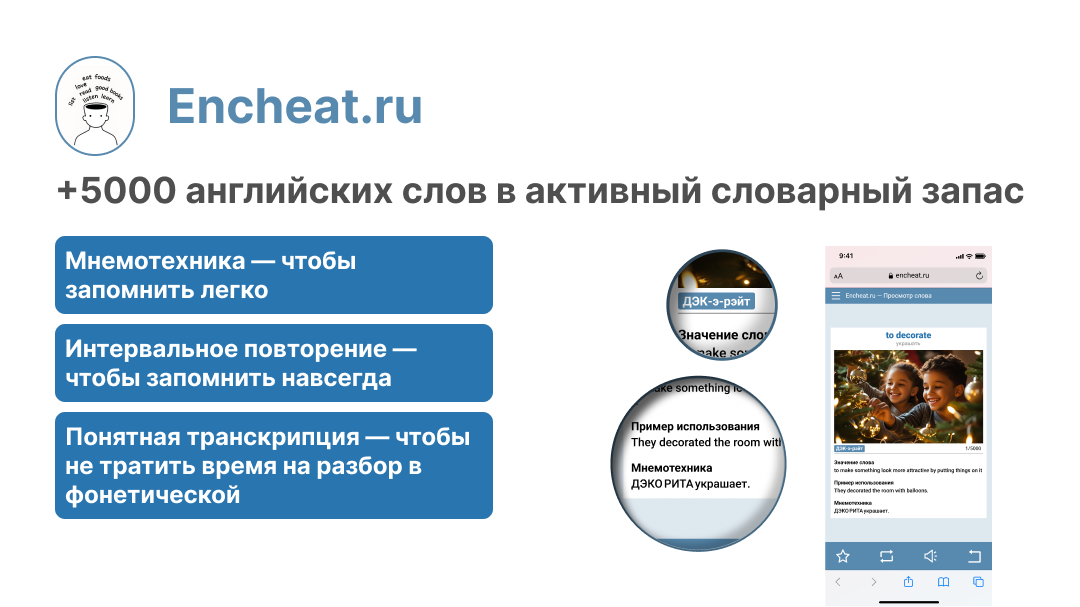 Нужный словарный запас — возьмите полную версию словаря-приложения Encheat.ru — 290 рублей полный доступ к 5000 нужным для коммуникации на английском языке словам и фразовым глаголам + собраны эффективные методики для легкого запоминания в карточках слов: пример контекста использования слова, картинка-ассоциация и мнемотехнический прием, отработка произношения через понятную транскрипцию и возможность озвучить слово, интервальное повторение для долгосрочного запоминания слова.
