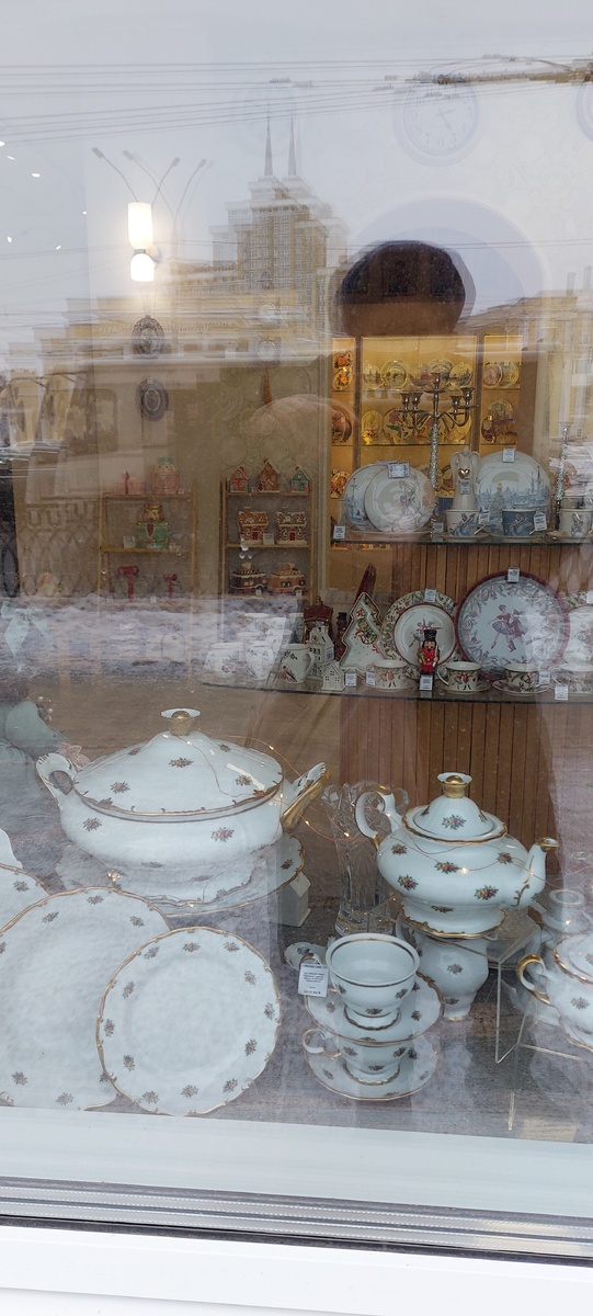 Вот недавно, при начинающихся сумерках немного поразглядывала дорогущую фарфоровую посуду через витрину на пл. Октября. Фото на телефоне получились конечно сложные и там видно и посуду, и площадь, и меня в стекле витрины, но сам факт моего развлечения они передают.