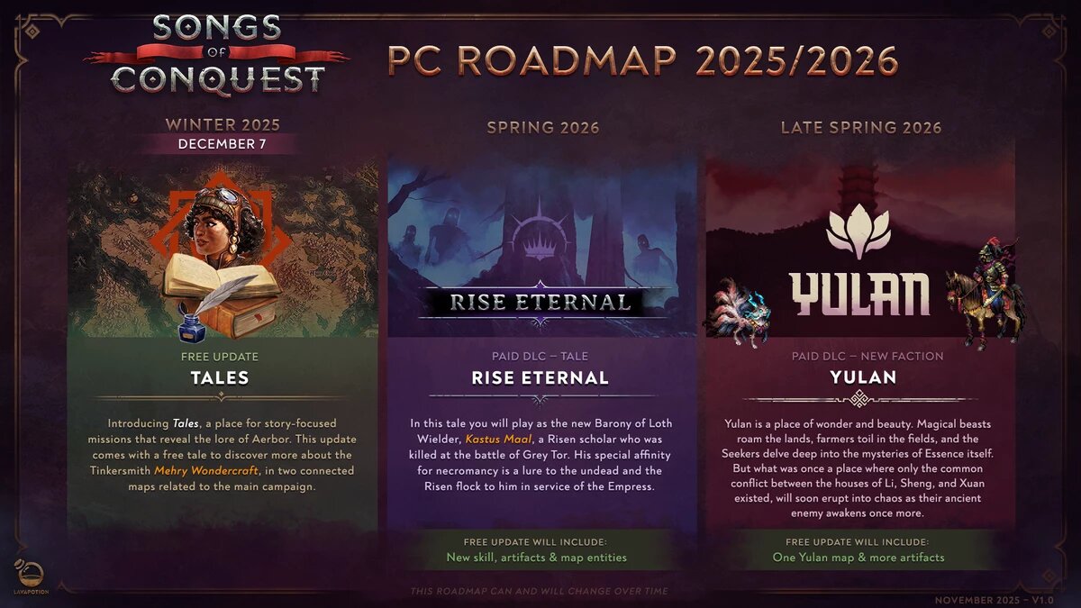 Студия Lavapotion представила обновлённую дорожную карту для ПК-версии Songs of Conquest, распланированную до конца 2026 года. План включает историю персонажа Мери, масштабное сюжетное дополнение Rise Eternal и первую информацию о новой фракции Юлан. Разработчики подчеркивают, что указывают только те обновления, сроки по которым могут гарантировать, тогда как работы над консольными версиями, включая порт для Nintendo Switch, продолжаются без конкретных дат релиза. Уже в ближайшие недели игроков ждёт обновление Tales, посвящённое Мери. Оно добавит две сюжетные миссии, раскроет тайны гибели маяков и продолжит историю Общества Невидимых. Одновременно будет переработан интерфейс меню и структура карты историй для лучшей навигации. Весной 2026 года выйдет дополнение Rise Eternal с четырьмя новыми миссиями, расширяющими лор, а также новыми игровыми механиками, артефактами и объектами на картах. При этом, как отмечают разработчики, песня от студийного барда в DLC не попадёт — её создание треб
