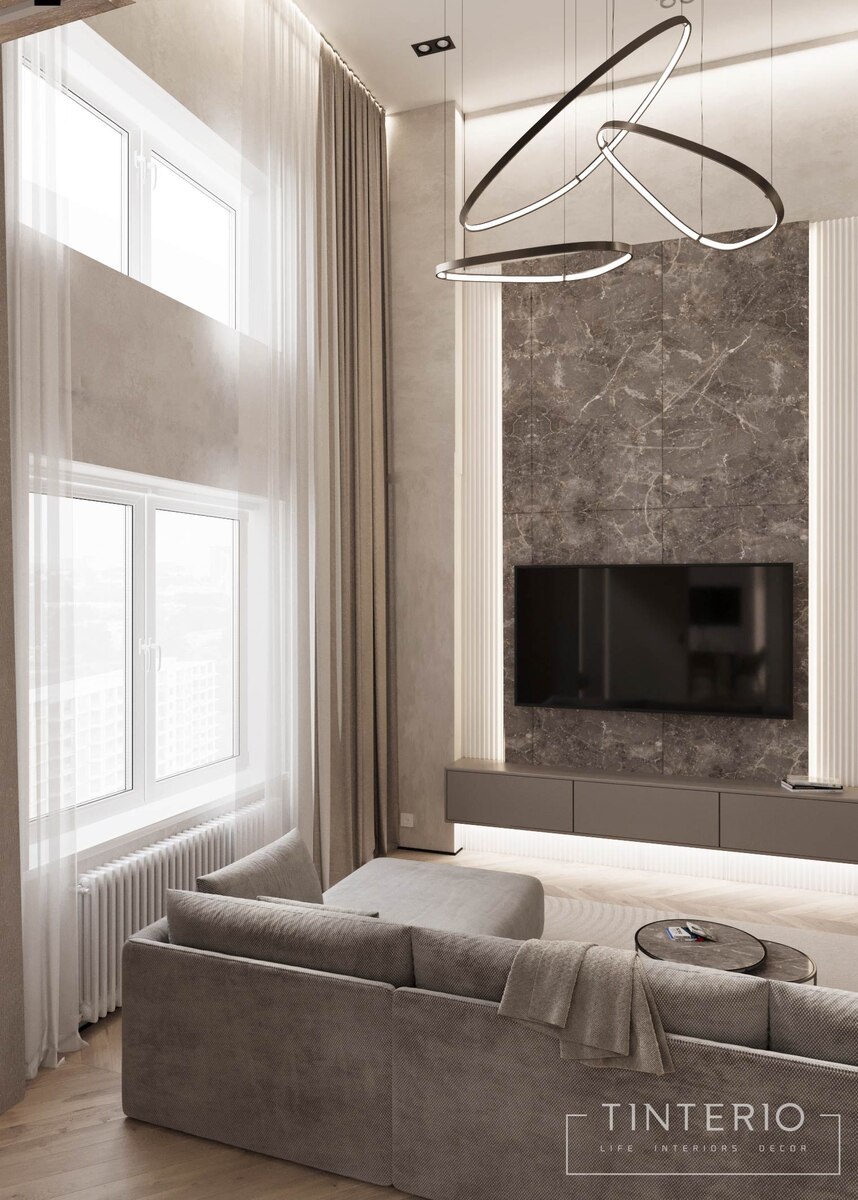 Центр квартиры — двусветная гостиная. Здесь расположен большой П-образный диван, на котором комфортно размещаются вся семья и гости. Напротив – медиа-зона с подвесной тумбой и крупным экраном. Для чаепития и настольных игр есть группа круглых журнальных столиков разной высоты.
