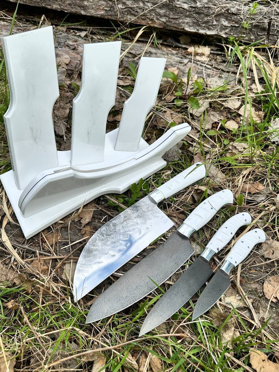 Готов в единственном экземпляре кухонный набор из трех цельнометаллических ножей и одной цельнометаллической сербской тяпки. Сталь на всех ножах выполнена х12мф с крио. На сербском ноже 95х18 с крио. Накладки акрил белый. Подставка на магните. Подставка выполнена из акрила белого. Твердость каждого ножа (HRC): 61-62 Твердость сербской тяпки (HRC): 58 Цена за набор: 62.560 рублей. В комплекте с каждым ножом идут ножны из натуральной кожи. Для заказа писать на @Nazarklinokbot или по тел +79101343831 WhatsApp/Viber/Telegram