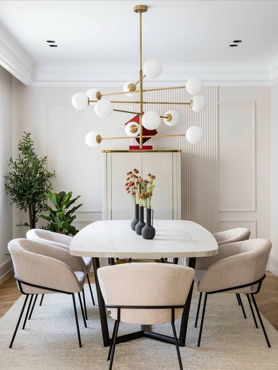 Как сделать столовую визуально дороже одним приёмом? Посмотрите, как работает стена за обеденной зоной: сочетание стеновой панели и элегантных молдингов создаёт глубину, собирает композицию и подчёркивает архитектуру пространства. Нежный оттенок стен становится более выразительным, а сама столовая — завершённой и продуманной. Сохраняйте этот проект для вдохновения 🤍