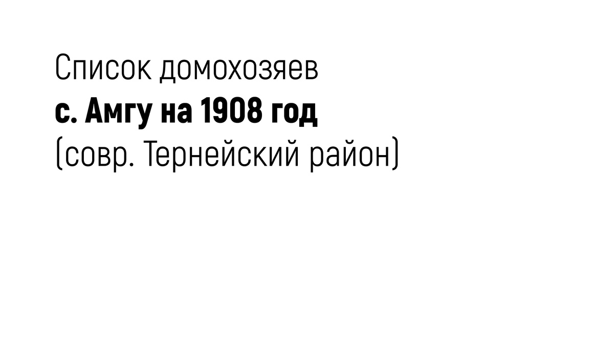 Фирс Бортников 22 домохозяина. Список домохозяев указан в подписантах к документу «Дело Приморского областного по крестьянским делам Присутствия об образовании селения «Амгу», Маргаритовской волости» от 16 сентября 1908 года Источник: