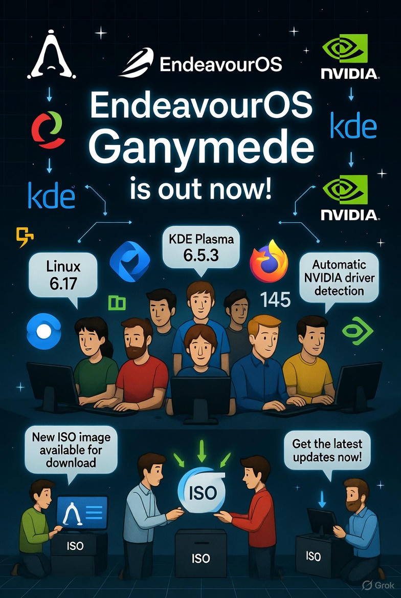 Представь: ты сидишь, ждёшь новый Arch, но без геморроя с ручной установкой. И тут — бац! — выходит EndeavourOS Ganymede. Прошло целых восемь месяцев с прошлой версии, и все уже начали шептаться: «А не загнулся ли проект?». Ага, щас! Разработчики просто взяли паузу, потому что у них, оказывается, тоже есть семьи, дети и коты, которые требуют внимания. Респект ребятам за честность. Что внутри коробки? - Ядро Linux 6.17 — свежее, как круассан из пекарни утром. - KDE Plasma 6.5.3 — выглядит так красиво, что даже моя бабушка сказала бы «ого!». - Firefox 145 — да, он уже почти пенсионер по меркам браузеров. - Mesa 25.2 и NVIDIA-драйвера 580-й серии. Но главное — они наконец-то починили ту боль, из-за которой все матерились: автоматический выбор драйверов NVIDIA. Теперь система сама решает, ставить тебе проприетарный драйвер или открытый, и делает это даже в Live-режиме. То есть приехал ты с ноутом на RTX 4090 — и сразу всё летает. Магия, а не установка. Про Broadcom тоже не забыли Помнишь
