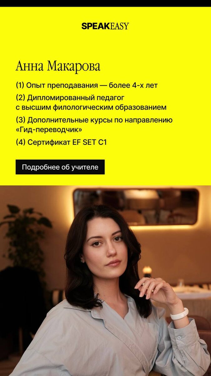 к преподавателю Анне свободно 1 место на занятие на выбор с завтрашнего дня: • 12:00 ИЛИ 14:00 по мск записаться на пробное (вниз к форме заявки)