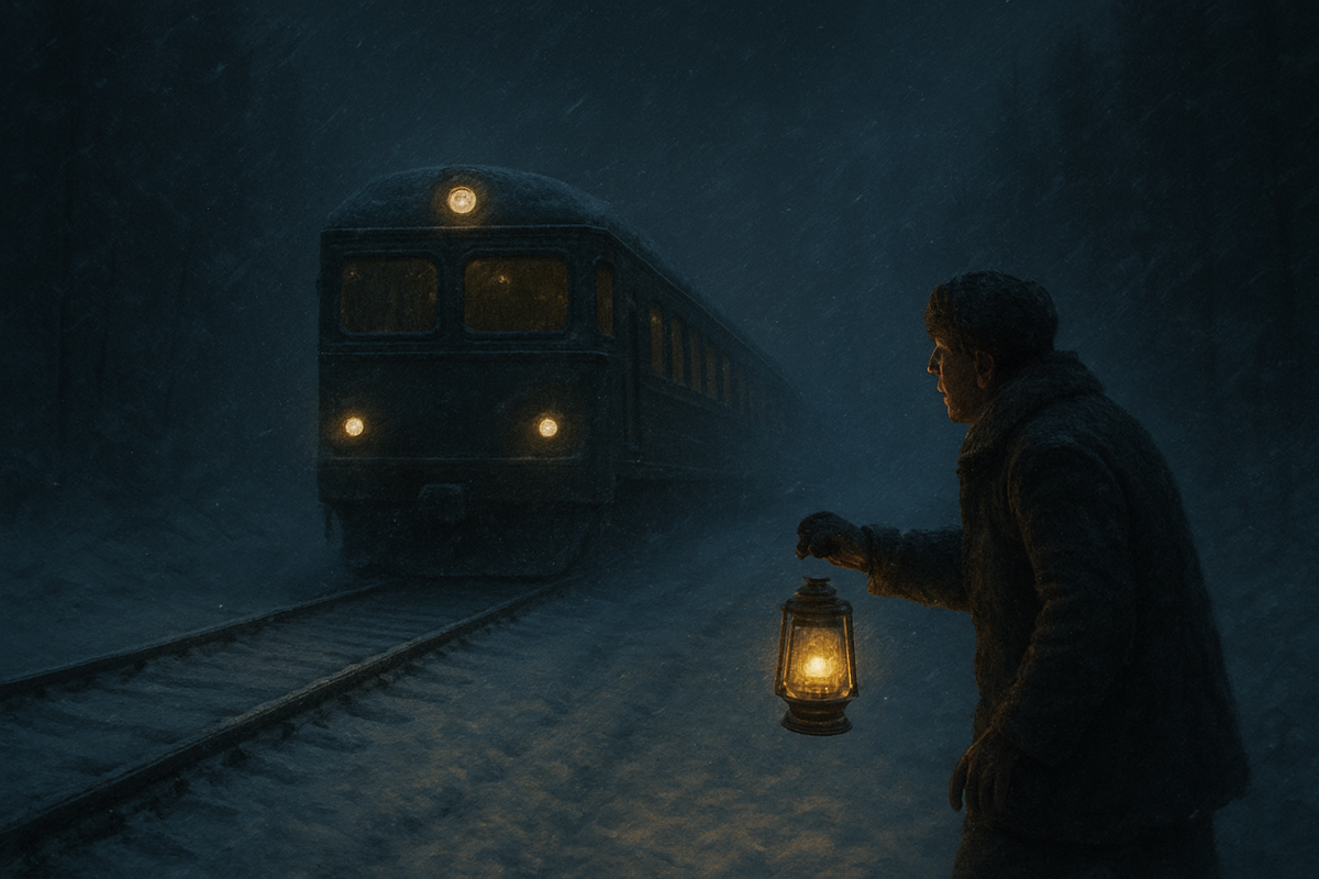 Тогда он вышел на улицу — и из пурги вынырнул состав: старый, довоенный, вагончики жёлтые, в окнах свет теплый, мягкий. Встал перед ним. Открылась дверь.
