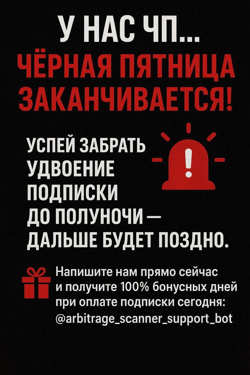 πΠΠ°ΠΏΠΈΡΠΈΡΠ΅ Π½Π°ΠΌ ΠΏΡΡΠΌΠΎ ΡΠ΅ΠΉΡΠ°Ρ ΠΈ ΠΏΠΎΠ»ΡΡΠΈΡΠ΅ 100% Π±ΠΎΠ½ΡΡΠ½ΡΡ Π΄Π½Π΅ΠΉ ΠΏΡΠΈ ΠΎΠΏΠ»Π°ΡΠ΅ ΠΏΠΎΠ΄ΠΏΠΈΡΠΊΠΈ ΡΠ΅Π³ΠΎΠ΄Π½Ρ: @arbitrage_scanner_support_bot