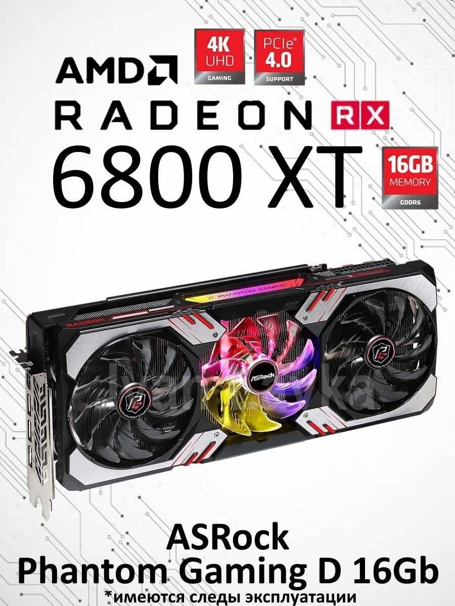 ASRock AMD Radeon RX 6800 XT Phantom Gaming — одна из самых удачных кастомных модификаций флагманского GPU на архитектуре AMD RDNA 2. Модель сочетает высокую производительность, качественное охлаждение и фирменный агрессивный дизайн линейки Phantom Gaming. Эта видеокарта отлично подходит как для топовых игровых систем, так и рабочих станций, требующих мощного графического ускорителя. ASRock традиционно делает ставку на массивные и эффектные системы охлаждения, и Phantom Gaming не стала исключением. Видеокарта получила: Конструкция выглядит внушительно: карта крупная и занимает 2,7 слота, что нужно учитывать при выборе корпуса. Подсветка RGB на кожухе и обратной стороне визуально подчеркивает игровую направленность модели. ХарактеристикаЗначениеГрафический процессорAMD Navi 21 XT (RDNA 2)Память16 ГБ GDDR6Ширина шины256 битInfinity Cache128 МББазовая / игровая / буст частотыЗависит от режима, до ~2310–2360 МГц (вариации OC)Пропускная способность памяти512 ГБ/сTDP (потребление)~300 ВтРаз