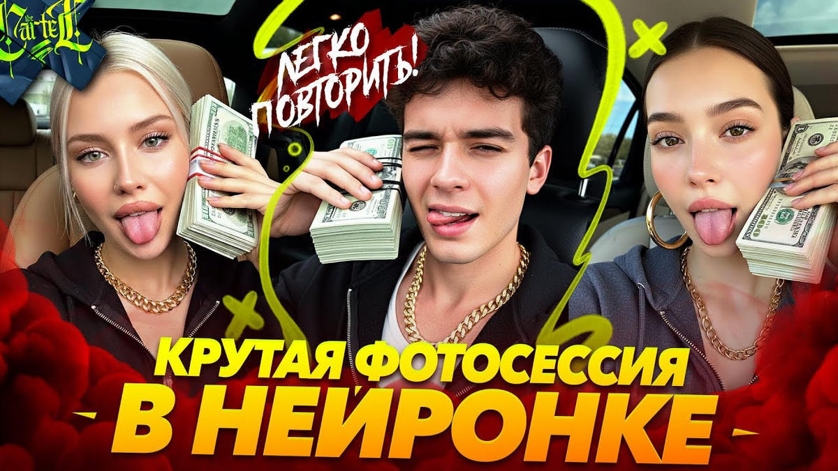 Пример промта: Here is my photo. Please use my appearance as a reference for generating the image. Keep my facial features. Create a hyper-glam selfie of a me sitting inside a car, captured in a close-up frontal view. Im has a tongue sticking out. Im holding a wrapped with a rubber band stack of dollar bills like a phone near ear. Wears a thick chain necklace, and a casual zip-up hoodie. The lighting is strong and glossy, emphasizing reflective highlights on the skin and accessories. The overall style should look like casual selfie, sharp details, and a luxurious, bold aesthetic. Add a subtle depth-of-field effect to keep the focus on the face and jewelry.