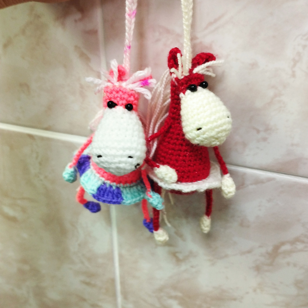 Добрый воскресный вечер! На этой неделе девушка купила лошадок, на следующий день пришла ещё за одной, говорит подруга увидела, тоже такую хочет. Мы с ней заговорили о игрушках, и я сказала что если мужу что-то понравиться, то он просит к себе в машину. У него в рабочей машине висела собачка, в пограничной фуражке. Девушка сказала что её муж тоже пограничник, и попросила чтобы я ей тоже такую связала, её муж будет очень рад такому подарку. Теперь надо искать ту схему, по которой я её вязала. Связала на этой неделе ещё три лошадки, в разных расцветках. Можно повесить хоть на ёлку, хоть в машину. Кстати на юбочку использую остаточки клубочков.можно использовать сразу несколько цветов пряжи, у меня два. Мне так даже больше понравилось, чем однотонная. У этой лошадки не только юбка связана так, но и тело,использую сразу три цвета. Ещё вязала на этой неделе мишку Саймона, из пряжи Лотос, которую покупала в Фикс прайсе. Она чуть потоньше чем дива, и я добавляла несколько рядов для тела
