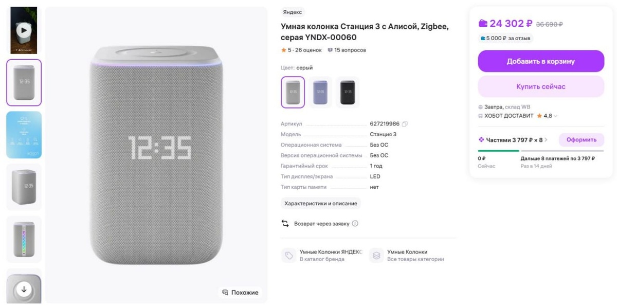 ⚡️Умная колонка Станция 3 с Алисой 👉 https://www.wildberries.ru/catalog/627219986/detail.aspx?targetUrl=SN ✅Цена 24 302р. + 5000 бонусов за отзыв ❗️У Вас ценник может быть ниже. Зависит от аккаунта Реклама вайлдберриз инн 7721546864