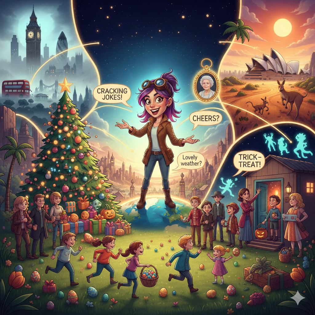 Привет-привет, мои отважные исследователи лингвистических джунглей! С вами снова ваша проводница по самым диким и непредсказуемым тропам английского языка, Crazy Tutor — Елена Велес! И сегодня мы отправляемся в кругосветное путешествие по англоязычным странам, чтобы разгадать их тайны, посмеяться над их причудами и, конечно же, еще сильнее влюбиться в этот удивительный язык!